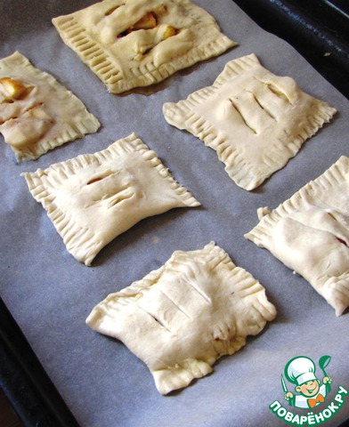 • На противень, выстеленный бумагой для выпечки, укладываем будущие слойки. Отправляем в разогретую духовку примерно на 20 минут.