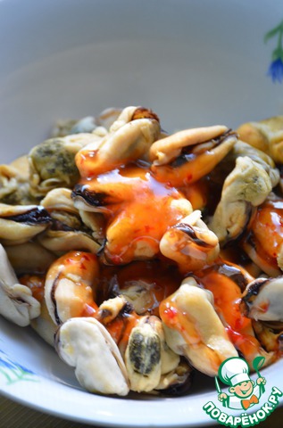 Мидии разморозить и слить жидкость. У каждой мидии удалить "бородку" (выступающий пучок волокон), промыть и откинуть на дуршлаг, затем смешайте мидии с соусом сладкий чили Blue Dragon