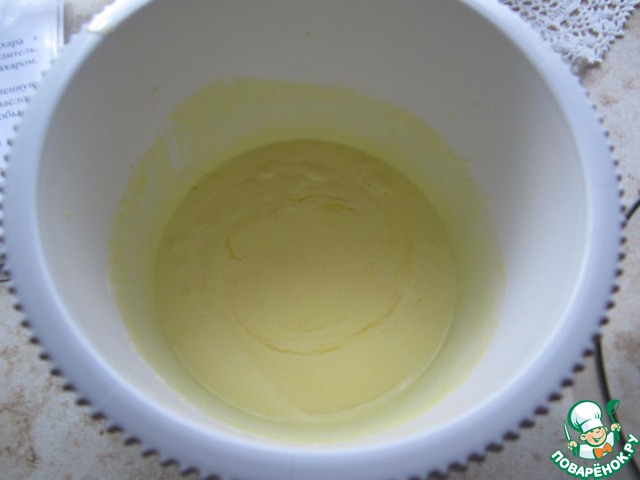 Взбить яйца с сахаром до пышной пены, в конце взбивания добавлять кусочками размягченное сливочное масло, продолжая взбивать.