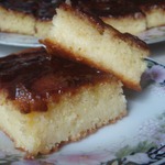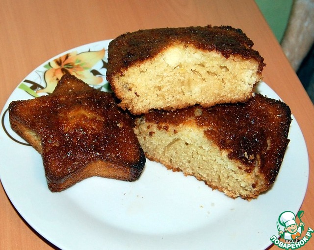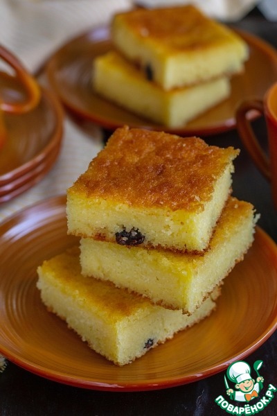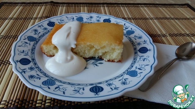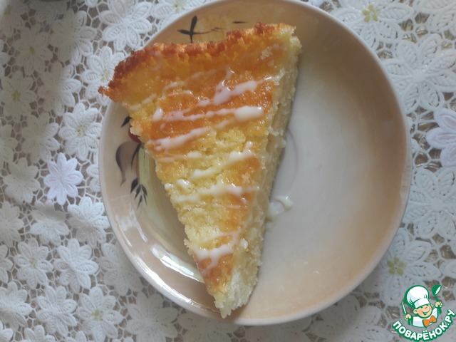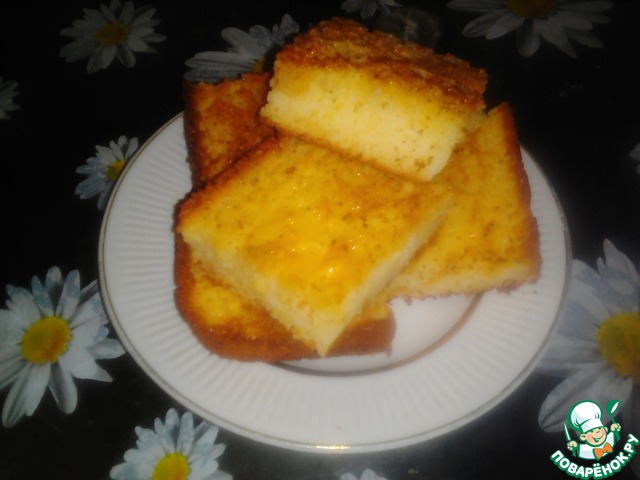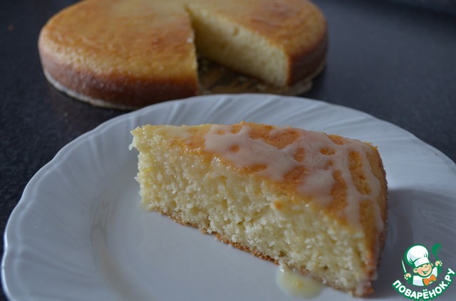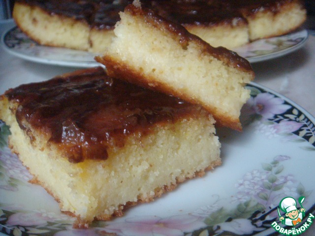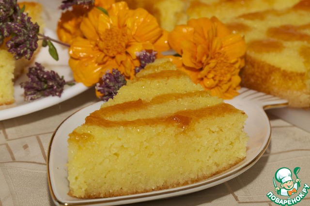 1/2 стакана сахара соединить с лимонным соком и водой, кипятить пару минут. Выпеченный манник в форме заливаю сиропом, остужаю. В данном случае полила абрикосовым вареньем. Режу на треугольники и подаю к столу. Приятного аппетита!