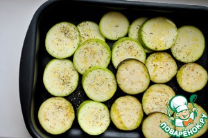 Кабачок и баклажан нарезать кружочками и запечь до готовности в духовке при температуре 180 градусов (около 30 минут)