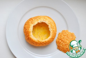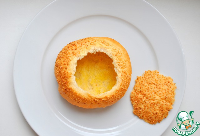 С хлеба срезать крышечку - верхнюю часть, вынуть мякиш, смазать внутри оливковым маслом