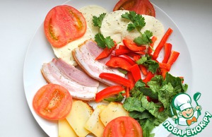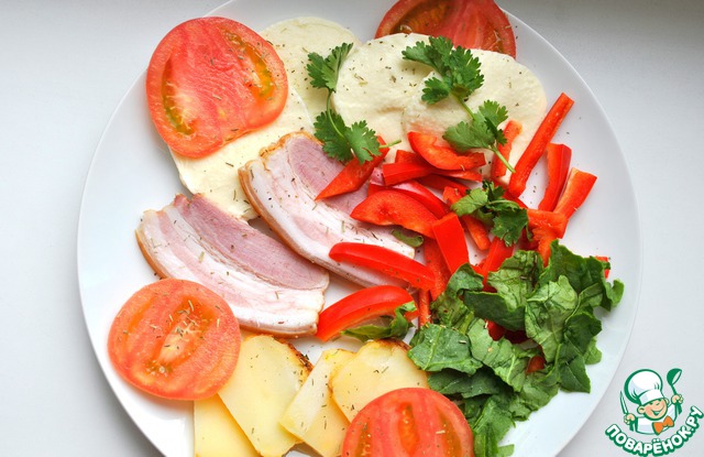 Нарезать помидоры, перец, картофель, карбонад, сыр. Всю начинку посолить, поперчить, добавить прованские травы