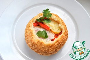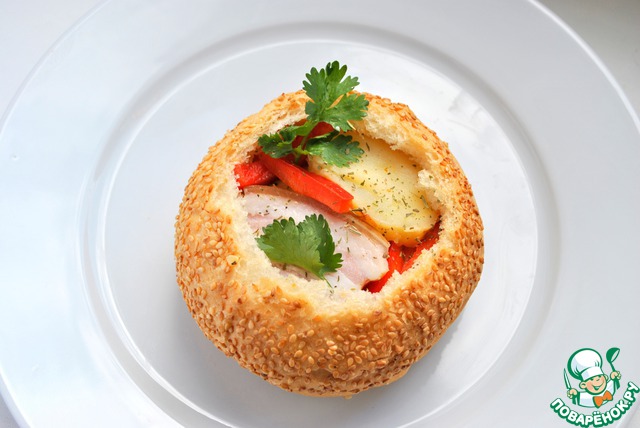 Затем выложить начинку в хлебные горшочки, накрыть крышкой, завернуть пищевой пленкой и поставить груз, убрать в холодильник минимум на 1-2 часа