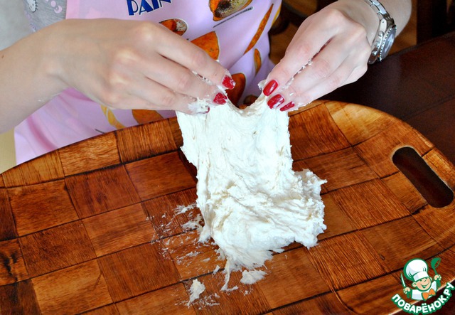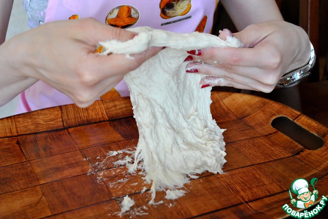 Затем тесто поднять в воздух и сложить вперед, выгибая аркой, таким образом тесто насыщается кислородом, при этом нужно растягивать тесто во все стороны. Таким способом нужно продолжать замешивать тесто, пока оно не станет эластичным, гладким и упругим.