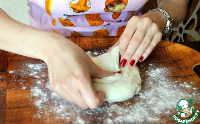 Затем слегка припылить рабочую поверхность мукой, выложить шар теста и по очереди заворачивать края к центру, вращая тесто вокруг своей оси.