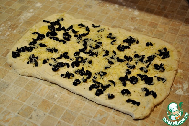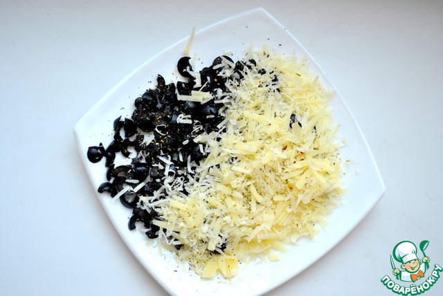 В это время приготовить начинку: сыр натереть на терке, из маслин удалить косточки и нарезать на небольшие кусочки.