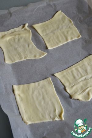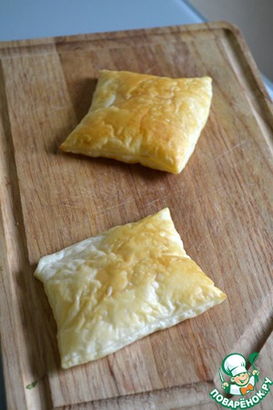 Слоеное тесто нарезать на квадраты стороной в 8-10 см. Печь до золотистого цвета (у меня ушло 10 мин., но вы следите по своей духовке). -