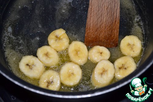 Добавить нарезанные бананы, размешать, чтобы бананы полностью покрылись соусом.