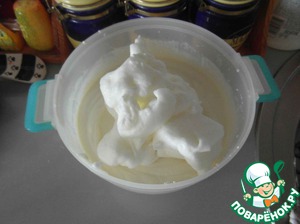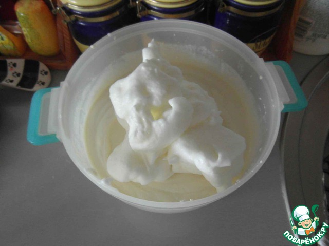 В полученную массу добавляем белки, взбитые в тугую плотную пену (я практикую добавление яиц полностью в творог, но со взбитыми белками тесто пышнее).