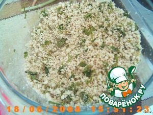 Заранее отварить грудку, прокрутить через мясорубку, смешать с зеленью (укроп, кинза)соль, перец