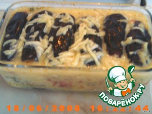 в форму выкладываем чуть тертого голландского сыра, на него баклажаны