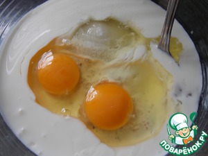 Добавляем 200 мл кефира (йогурта), 2 яйца. Сахар - смотрите сами: если ваша выпечка была сладкая, то он может и не понадобиться. То же самое с солью. У меня хлеб был несладкий, поэтому я сахара добавила 2 ст. л. Соли не добавляла совсем.