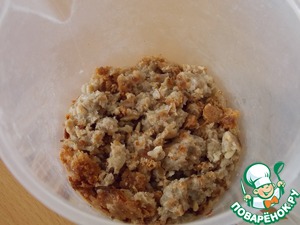 Отмеряем 125 мл молока или воды и опускаем в эту жидкость столько неполучившейся выпечки, сколько влезет, чтобы молоко/вода ее полностью покрывали. Оставляем на несколько часов, чтобы выпечка полностью раскисла. У меня в данном случае был непропеченный хлеб, я замачивала его в воде.