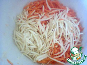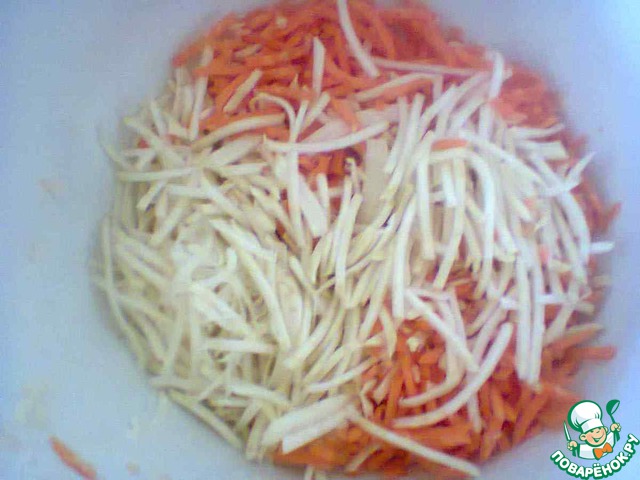 Нарезать тоненькой соломкой. Это можно сделать или с помощью тёрки для приготовления салатов "по-корейски", или с помощью аналогичного специального ножа, или ещё легче - если есть комбайн и соответствующая насадка. Если ничего этого нет, то просто натереть на крупной тёрке.