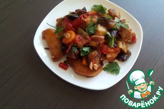 Сковороду разогреть, положить туда подготовленные овощи, добавить примерно 1/4 стак. воды и протушить 5-10 мин. За это время перемешать 1-2 раза. К сожалению, забыла сфотографировать отдельно протушенные овощи.