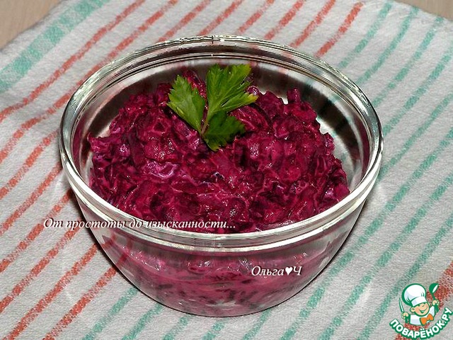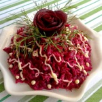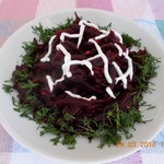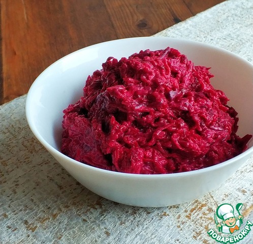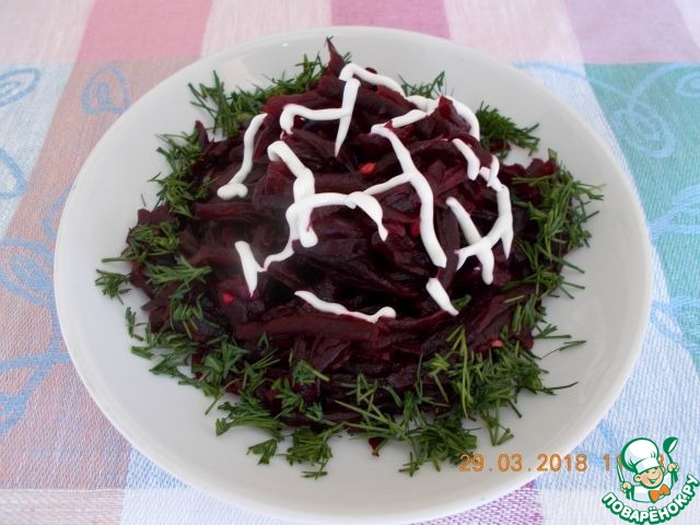 Чеснок через пресс пропустить и перемешать с тертой свеклой. Заправить салат майонезом.