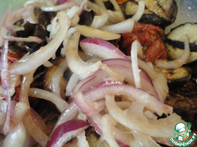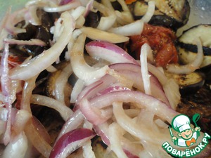 Добавляем нарезанный полукольцами ялтинский лук. Тоже накрываем крышкой и встряхиваем. Оставляем лук мариноваться.