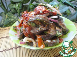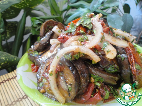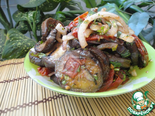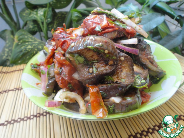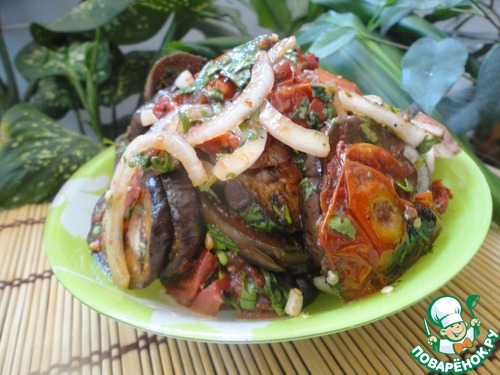Соединяем в посудине запеченные помидоры с баклажанами, добавляем лук вместе с заливкой. Сюда добавляем мелкорубленую кинзу и петрушку. Хорошо перемешиваем и оставляем промариноваться минут на 15-30.