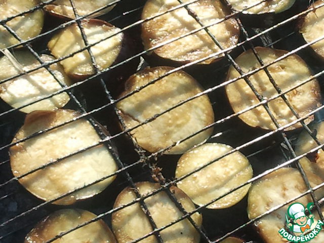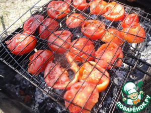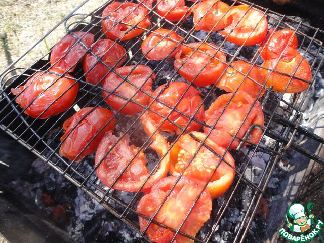 Пока баклажаны маринуются, займемся помидорами. Режем их кружками тоже примерно по 1 см, выкладываем на решетку и запекаем на мангале. В процессе запекания - слегка подсаливаем.