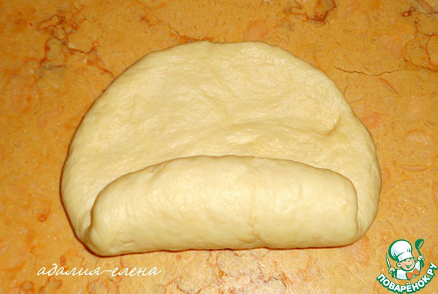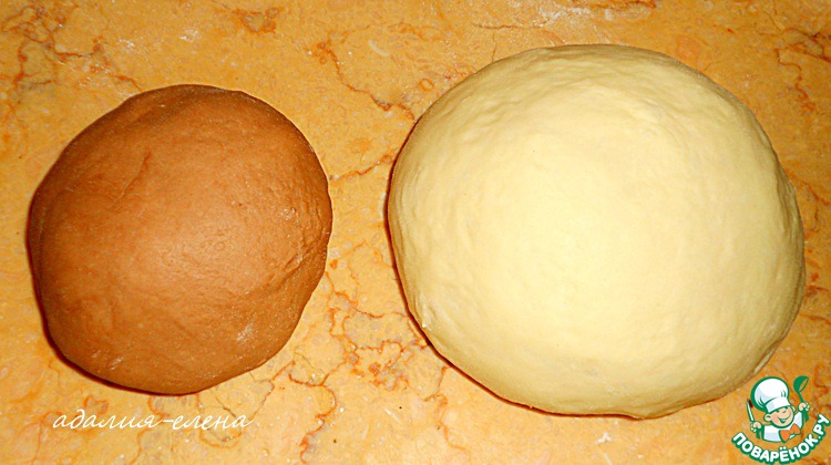 • Белое тесто снова разделить на большую часть и две маленькие части. Большую часть слегка раскатать и свернуть,