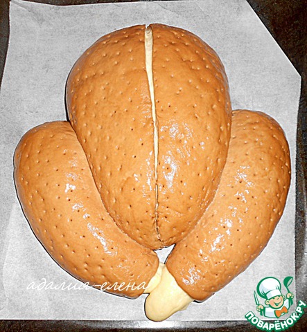 • Далее смазать тесто яйцом и наколоть его поверхность зубочисткой, имитируя шкуру индейки. Сделать посередине горизонтальный надрез острым ножом или лезвием. Поставить хлеб выпекаться при 180*С 30-40 мин.