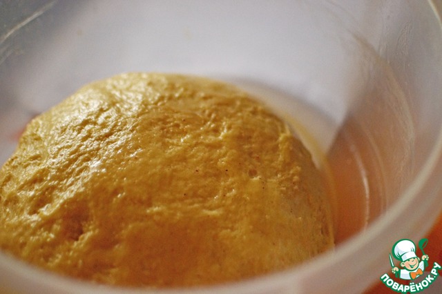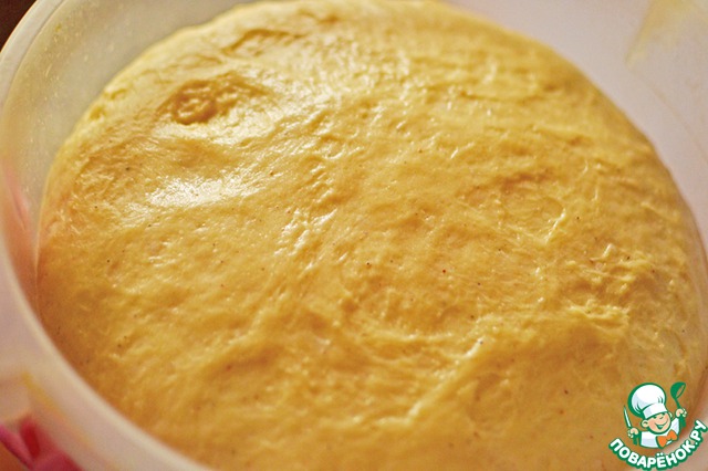 Тесто поднимается около часа и увеличивается в два раза. После подъёма тесто обмять. Тесто должно начать "пищать".