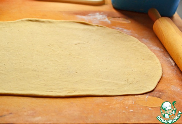 Раскатайте оставленную треть очень тонко. Около 5 мм толщиной. Старайтесь получить прямоугольник. Около 30 на 60 см. -