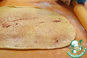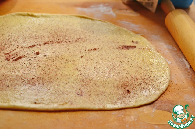 Смазать растопленным маслом, посыпать сахаром и корицей.