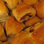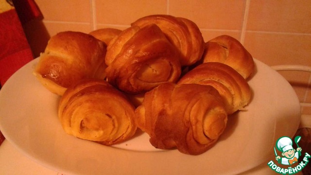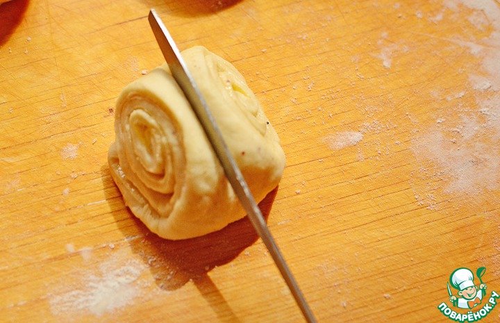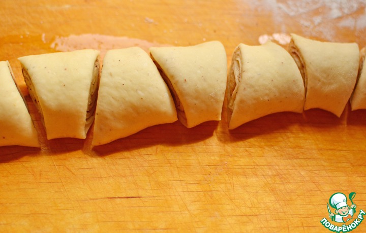 Скатать тесто в рулет по широкой части. Нарезать на порционные булочки вот таким образом. Узкая часть - 2 см, широкая - 4-5 см. Постарайтесь, чтобы шов был снизу.