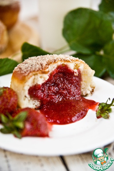 С помощью кондитерского мешка наполнить каждый пончик клубничной начинкой и обвалять в сахаре.