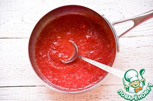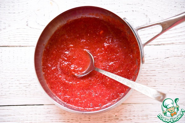 • Для начинки в блендере измельчить клубнику. Перелить клубничное пюре в сотейник, добавить сахар и лимонный сок. Довести до кипения и варить на среднем огне минут 20. Остудить.