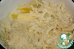 В пюре добавляю подогретое молоко, тертую моцареллу, оставшийся пармезан, перчу. -