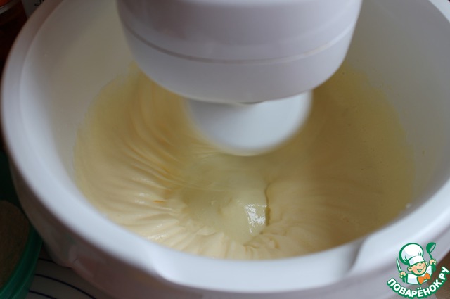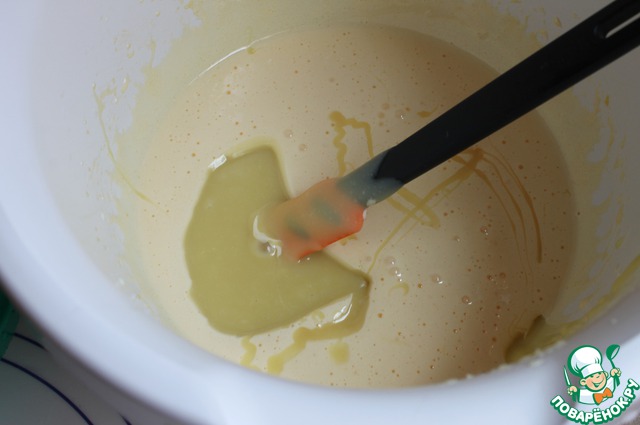 Делаем бисквит. Взбиваем яйца с сахаром и солью примeрно 5 минут. Затем я тонкой струйкой влила растопленное масло.