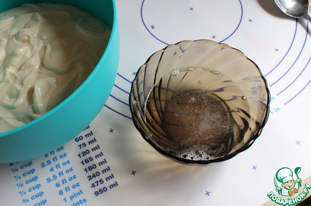 Я его отжимаю и ставлю в микроволновку на 1 минуту для растворения его. Затем в чашку с жидким желатином кладу 2 ст. л. кремa творожного, размешаю и эту массу потом выливаю в крем.