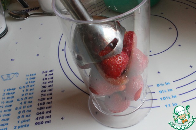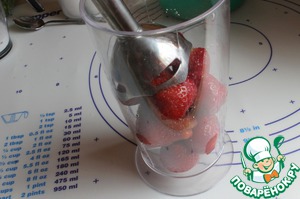 Клубнику пюрируем, добавляем конфитюр и еще раз взбиваем.