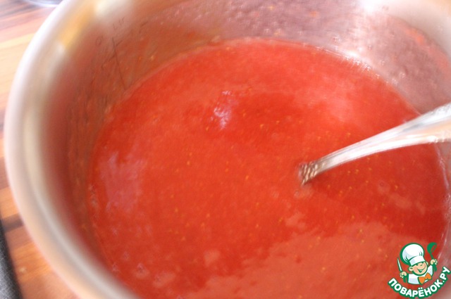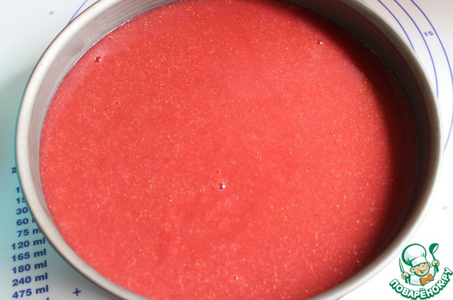 Желатин заранее замочим в воде, затем отожмем и добавим в пюре. Хорошо размешаем и ставим остывать, я убирала в холодильник. Можно это сделать заранее и оставить на столе, он дольше остывает. -