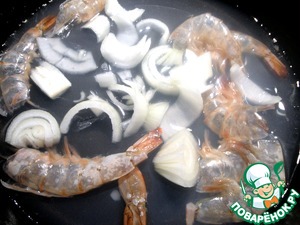 Креветки очистить (можно заменить на раков). Панцири положить в кастрюлю. Добавить нарезанный лук и залить водой, чтобы немного покрыть продукты. Довести до кипения и, убавив огонь, варить мин.20.