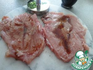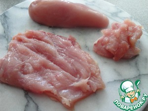 Куриную грудку надрезать посередине и «раскрыть, как книгу". Слегка отбить более толстую сторону грудки, чтобы получилось одной толщины. Самые тонкие края отрезать.