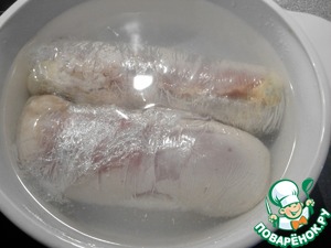 Воду в кастрюле довести до кипения, положить туда грудку в пленке и, убавив огонь до минимума, варить 20 мин.