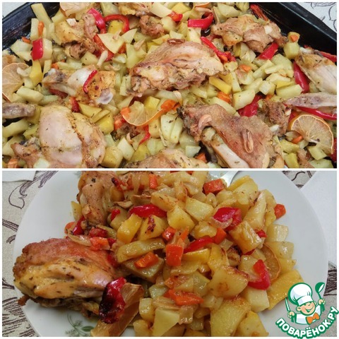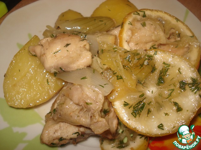 Немного изменила использование лимона: из половины небольшого лимона выдавила сок, вторую половину лимона порезала кольцами и разложила на курице и картошке. Так в следующие разы я спокойно использовала больше лимона, нам кисленький вкус курицы нравится. Единственное, с чем надо быть осторожным, так с тем, что на следующий день лимон начинает горчить, поэтому для меня получается это блюдо на один раз. А вот если использовать только лимонный сок, то можно и на следующий день подавать, как, собственно, у Алины и делалось.