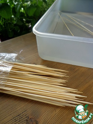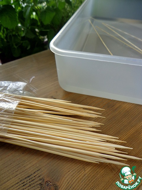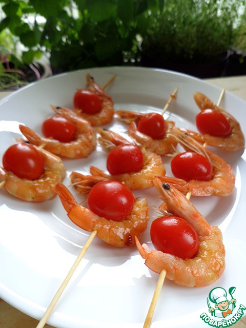 Креветки насадить на шампуры, помещая между головой и хвостом по помидорчику черри.