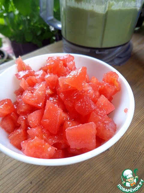 Авокадо, чеснок и лимонный сок измельчить в блендере до получения однородной массы. Добавить помидоры, перемешать. Посолить, приправить свежемолотым перцем.