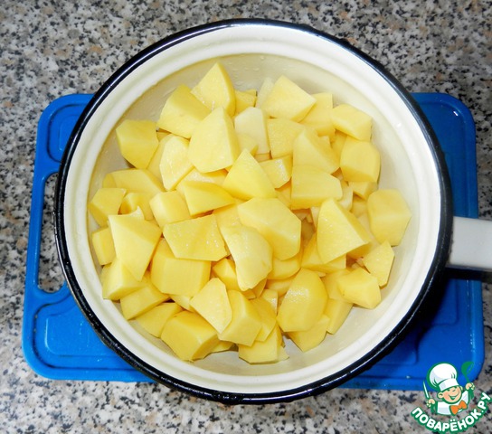 Очищаем и моем картофель, заливаем холодной водой, нарезаем кубиками перед тем, как отправить в бульон.