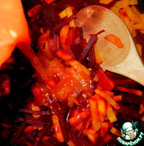 Отправляем свеклу тушиться, добавляем водички с 0,5 стакана, тушим 5 минут, затем добавляем морковь и тушим до готовности, проверяем, чтобы вода не выкипела, добавляем ещё по необходимости (тушение займёт примерно всё то время, что подготовка других овощей) -