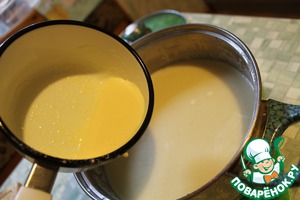 для приготовления льезона разбалтываю вилкой желток и заливаю 100 мл горячего, но не кипящего молока и прогреваю до загустения. -