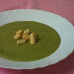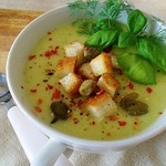 Подавать суп-пюре с мелко нарезанными листьями базилика и гренками из белого хлеба, обжаренного в чесночном масле.