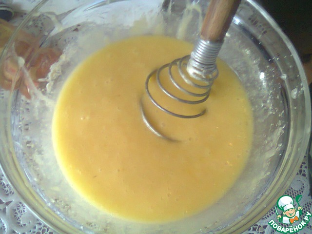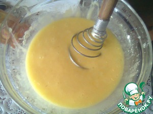 • 2. Выложить в емкость размягченное масло, добавить сахар и яйца, тщательно взбить венчиком (также можно взять миксер)
