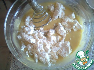• 3. Далее добавляем творог, муку, соль, разрыхлитель.