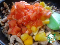 Затем перец и помидоры. Готовим, помешивая, пока жидкость немного не выпарится. Посолить, если нужно. |